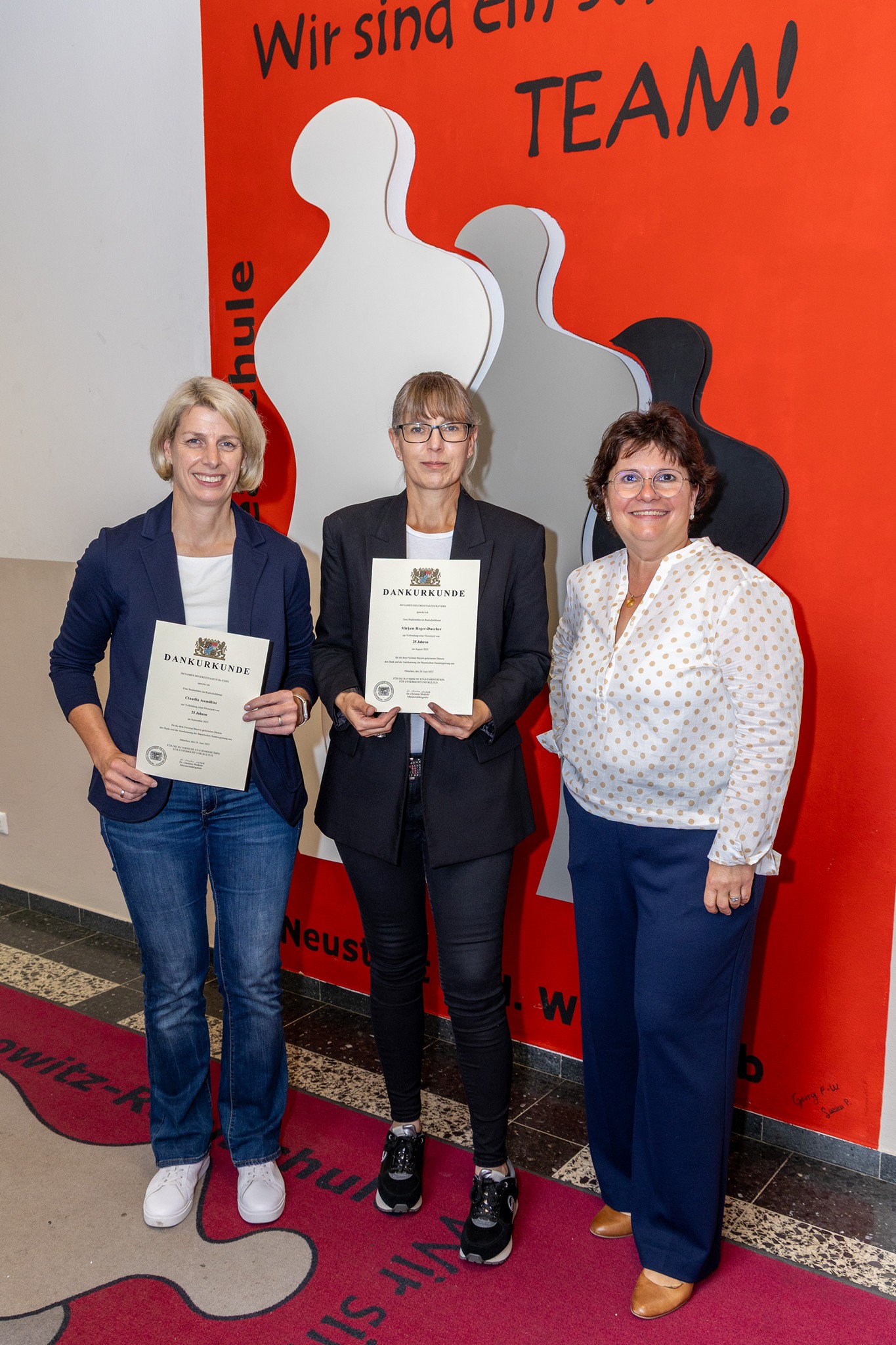 Grund zur Freude gab es gleich zu Schuljahresanfang, als die Lobkowitz-Realschule vom Bayerischen Staatsministerium für Unterricht und Kultus gleich zwei Dankesurkunden für 25jährige Dienstzeit erhielt, welche für Studienrätin Mirjam Heger-Duscher und Studienrätin Claudia Aumüller bestimmt waren. Schulleiterin Irene Sebald gratulierte beiden erfahrenen Lehrkräften für ihr vorbildliches langjähriges Wirken, Bilden und Erziehen an der Lobkowitz-Realschule und überreichte beiden Dienstjubilarinnen die hohe Auszeichnung. Frau Heger-Duscher unterrichtet die Fächer Deutsch und Geschichte, deren Fachschaft sie auch leitet. Frau Aumüllers „Lieblingsfächer“ sind ebenfalls Deutsch aber auch Geografie. Herzlichen Glückwunsch zu diesem stolzen Jubiläum!