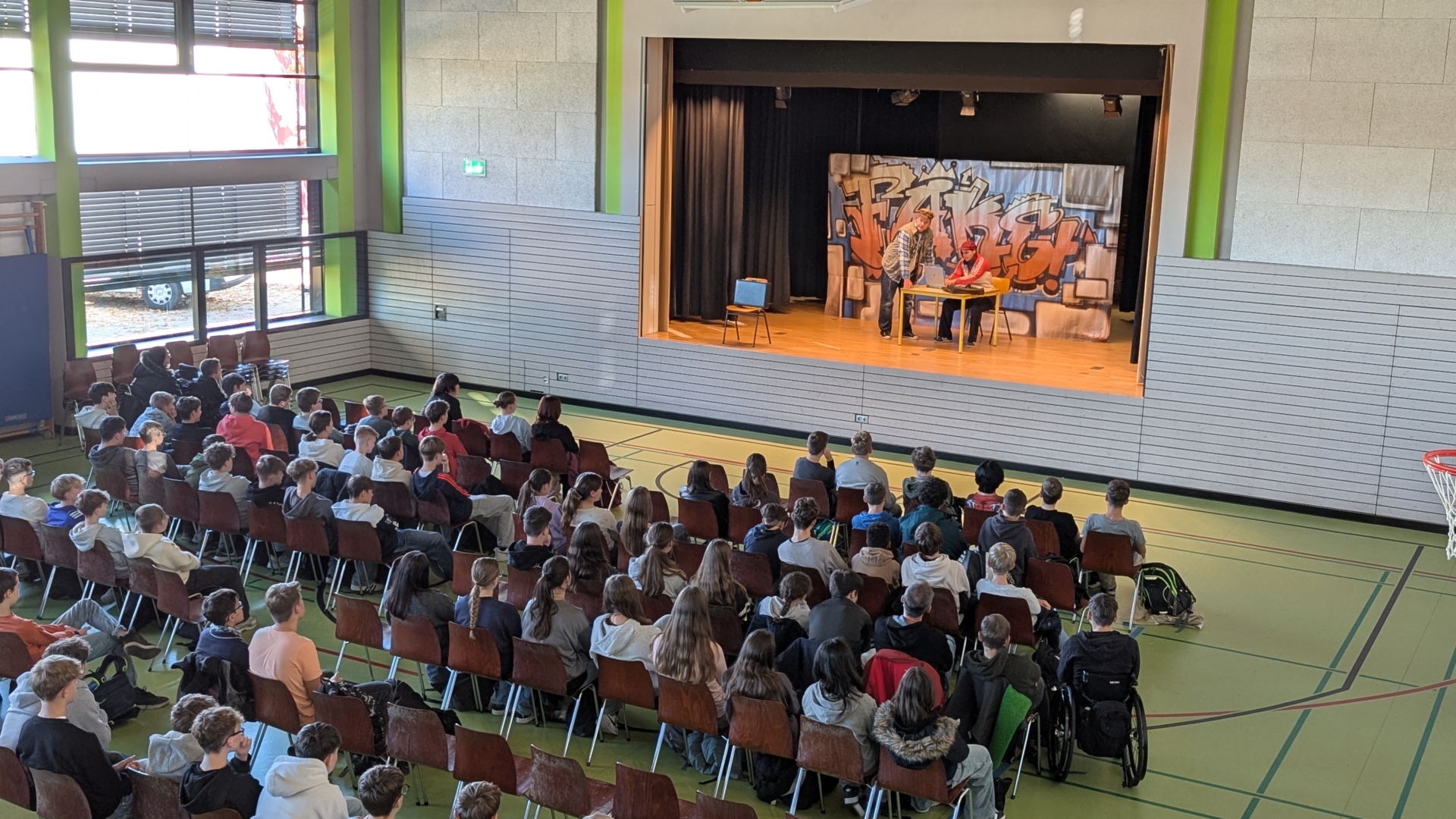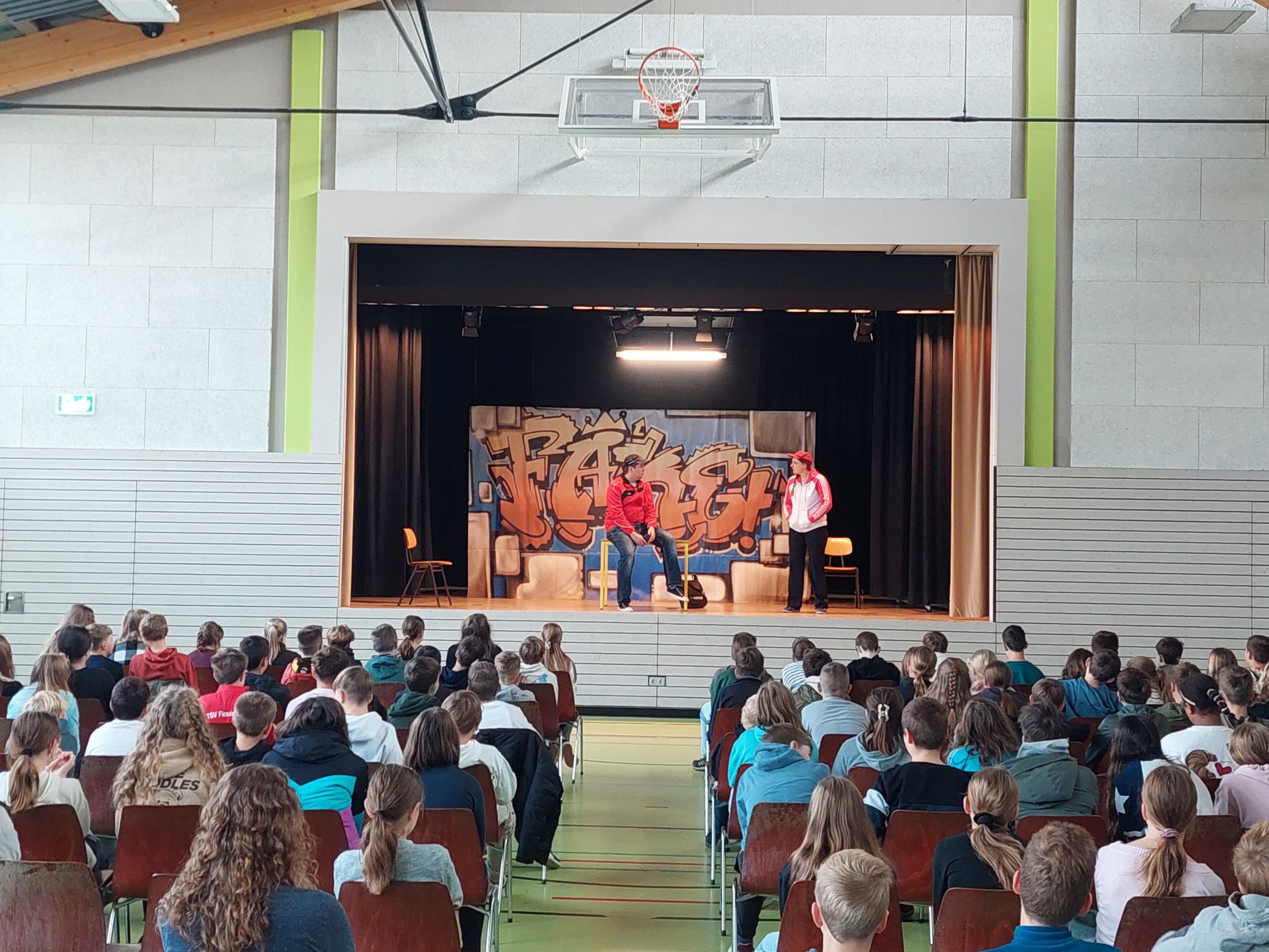 Am Dienstag, den 14. Oktober, fand für die Schülerinnen und Schüler der 6., 7. und 8. Klassen ein besonderes Theatererlebnis statt: Das Stück „Fake – oder war doch nur Spaß“ wurde im Rahmen der Woche der Nachhaltigkeit und Gesundheit aufgeführt und widmete sich dem hochaktuellen Thema Cybermobbing. Aufgeführt wurde das Stück von der Theatergruppe „Radiks“ aus Berlin.