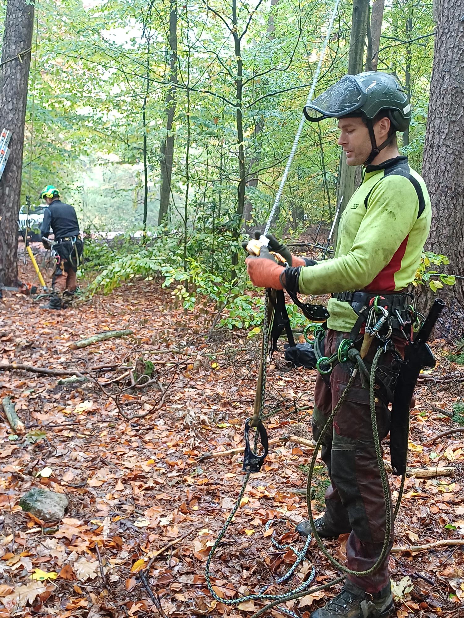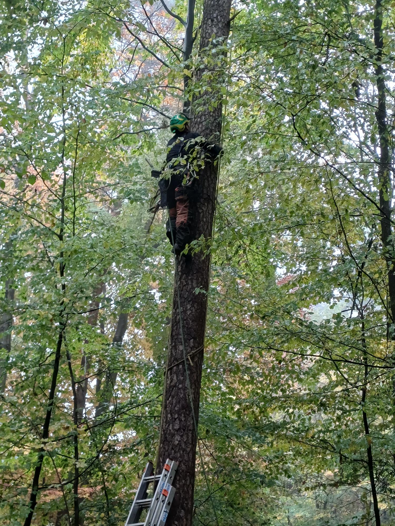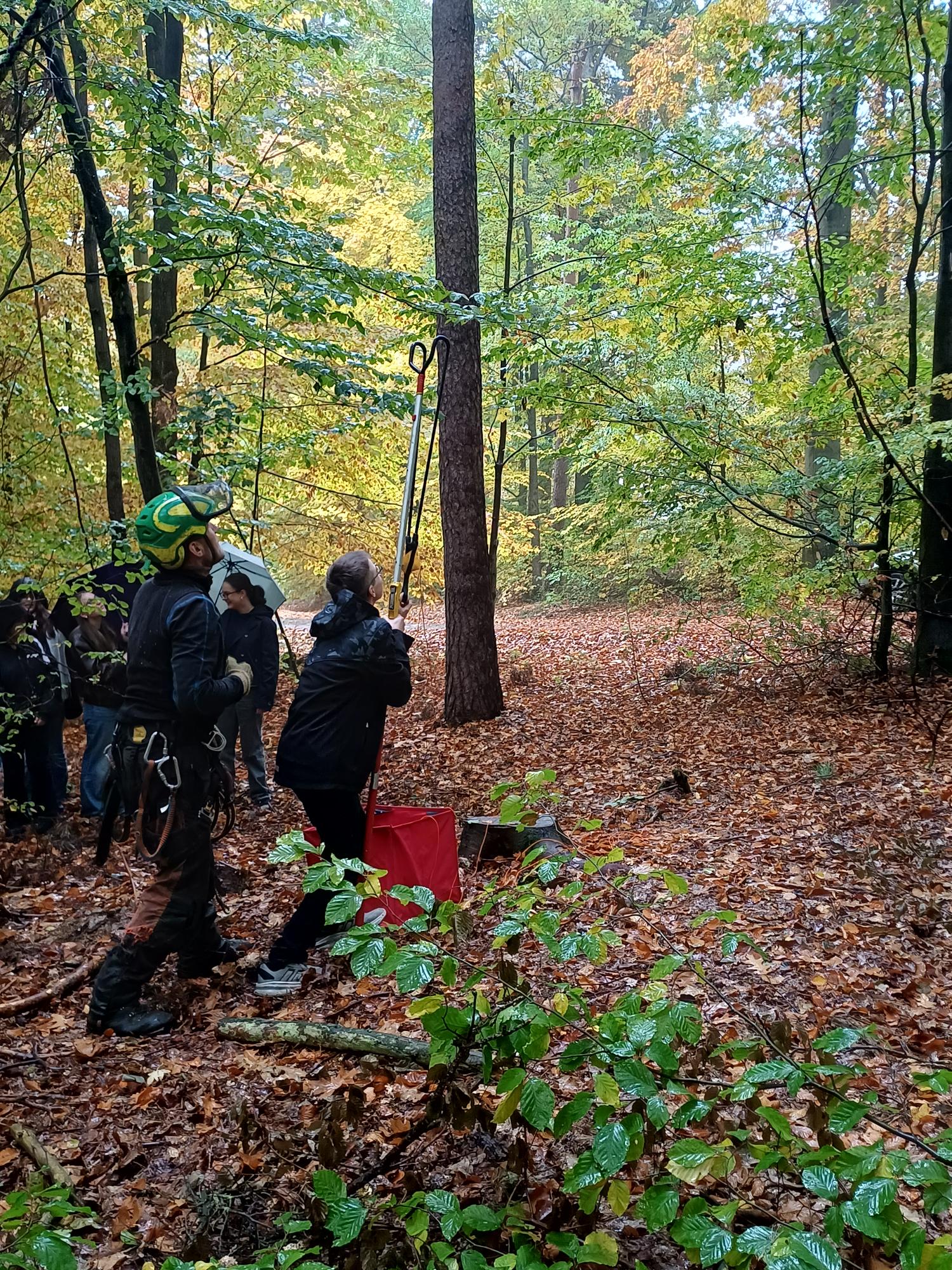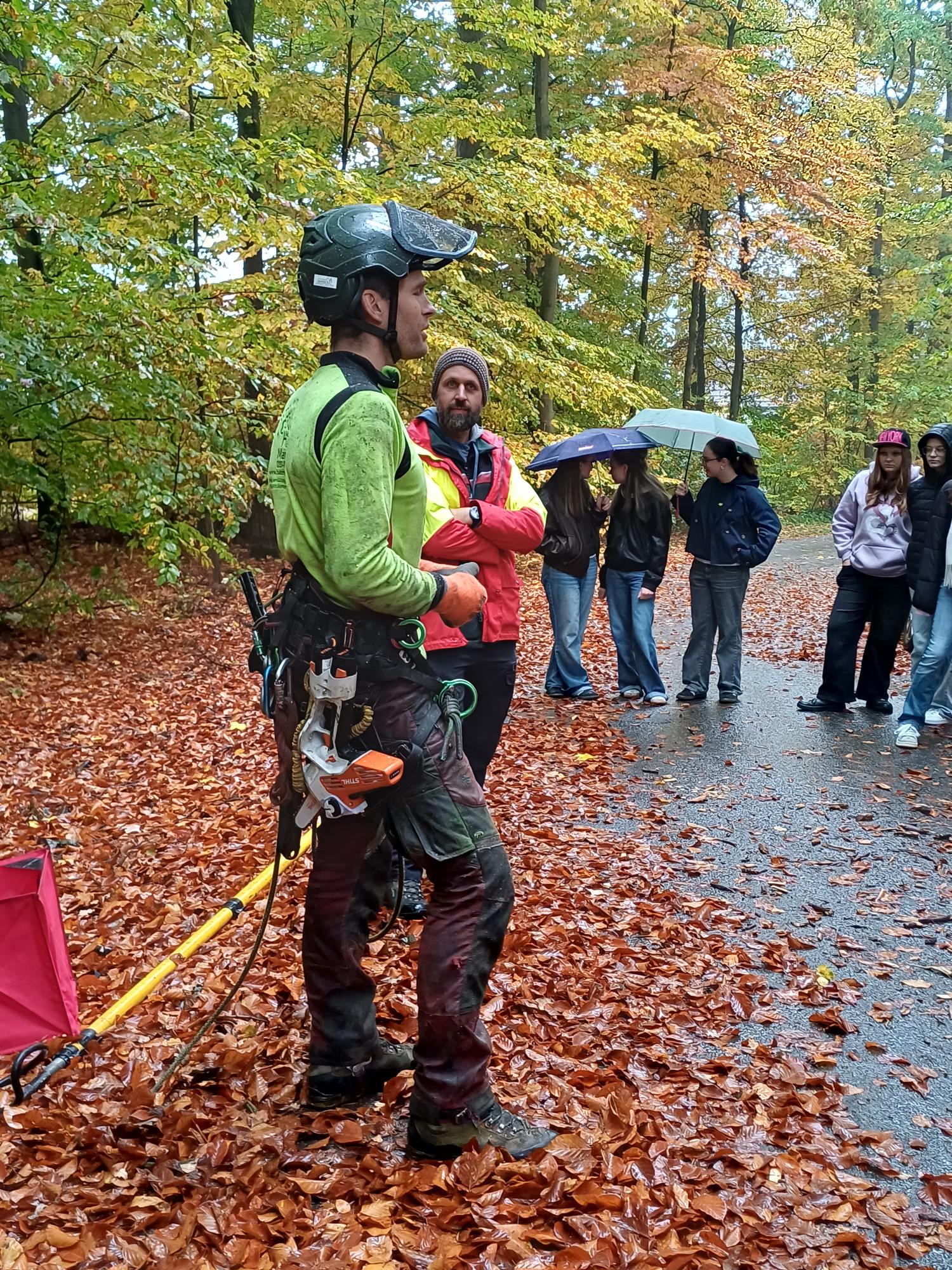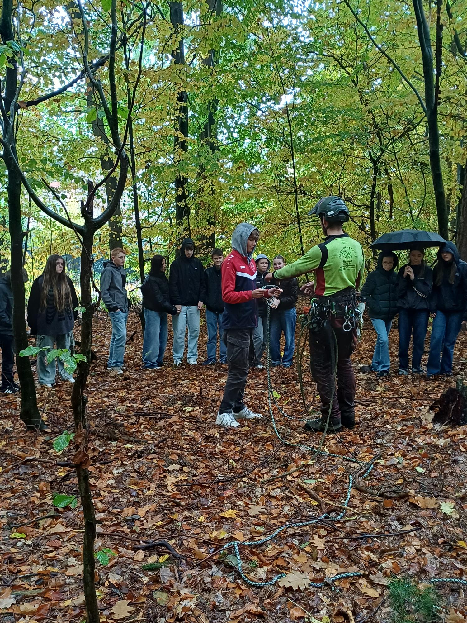 Den Schülerinnen und Schülern der Klasse 9c bot sich vergangenen Mittwoch in ihrem Geografieunterricht eine besondere Gelegenheit – sie durften dabei sein, als Baumkletterer im Schulwald zugange waren. Herr Manfred Härtl erklärte den Mädchen und Jungen seinen beruflichen Werdegang, der sich vom Zimmermann, über den Forstwirt, bis hin zum Baumpfleger erstreckte. Dabei führte er sein Equipment vor und erklärte, worauf man in seinem Beruf besonders achten muss. Herr Härtl betonte auch immer wieder, dass es das Wichtigste sei, für seinen Traumjob zu brennen und nicht nur auf das Gehalt zu achten. Schließlich durften die Schülerinnen und Schüler auch selbst aktiv werden; so konnten sie versuchen, einen Karabinerhaken zu öffnen, ein Seil in die Baumkrone zu katapultieren und einen sicheren Knoten zu schnüren. Zu guter Letzt durfte die Klasse 9c dann noch begutachten, wie Herr Hermann Prölß Totholz aus der Krone einer 35 Meter hohen Kiefer absägt. Und wer weiß… vielleicht hat ab sofort der ein oder andere Schüler seinen neuen Traumberuf für die Zukunft gefunden.