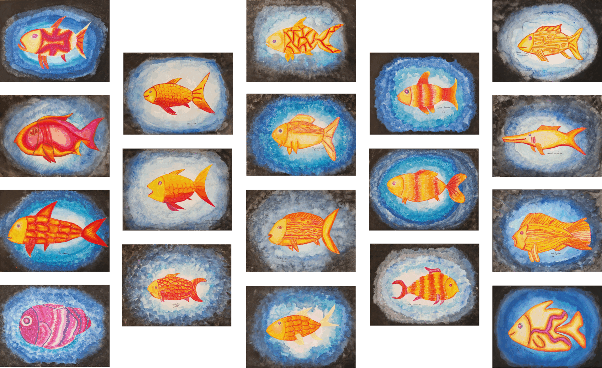 Unsere 5. Klassen versuchten genau dies umzusetzen in ihren eigenen Fischen. Mit Wassermalfarben und dicken Borstenpinseln wurden die Hintergründe gemalt, wobei die Kinder viel Spaß dabei hatten, ihre Tische schmutzig machen zu dürfen. Der Fisch selbst wurde mit Ölpastellen gestaltet, wobei die Plastizität des Fisches bestmöglich betont werden sollte. Vielen ist das mehr als gut gelungen.