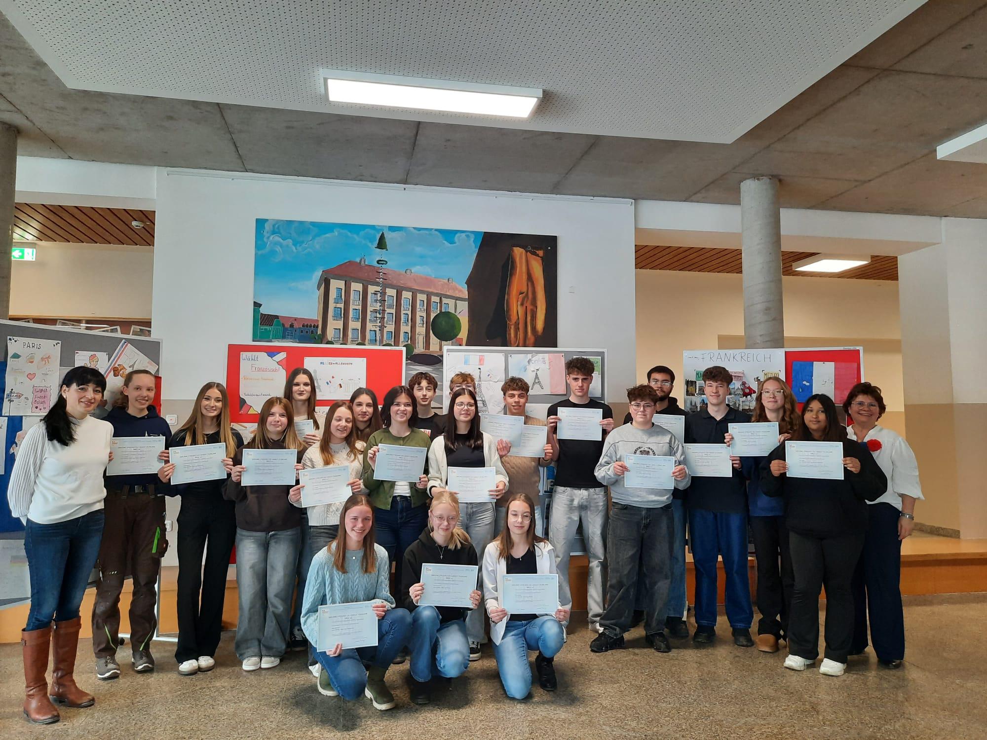 In der vierten bis zur sechsten Stunde war die Aula dann gut gefüllt. Linda Hackl, Mia Krassler und Luisa Oppel aus der Klasse 10d präsentierten eine PowerPoint Präsentation, die den Schüleraustausch sowie die deutsch-französische Geschichte zum Inhalt hatten. Im Anschluss wurden dann die Schüler der Klasse 10d (IIIa) von Frau Sebald mit ihren DELF Diplomen ausgezeichnet. Diese Diplome werden vom französischen Bildungsministerium vergeben und sind vom institut francais aus München versandt worden. Selbstverständlich haben alle Teilnehmer diese Auszeichnung mit Bravour bestanden! Alle Französischschüler waren zu einer kreativen Variante des Bingo Spielens eingeladen. Sie mussten aufmerksam den Chanson Strophen von Hervé folgen. Auf ihren Spielfeldern galt es nun, die richtigen Strophen zu finden. Delia Zaharia aus der 7c, durfte sich einen der begehrten Preise abholen. Mit viel Freude erwarten die Schüler nun ihre Frankreichfahrt, die im Oktober dieses Jahrs stattfinden wird.