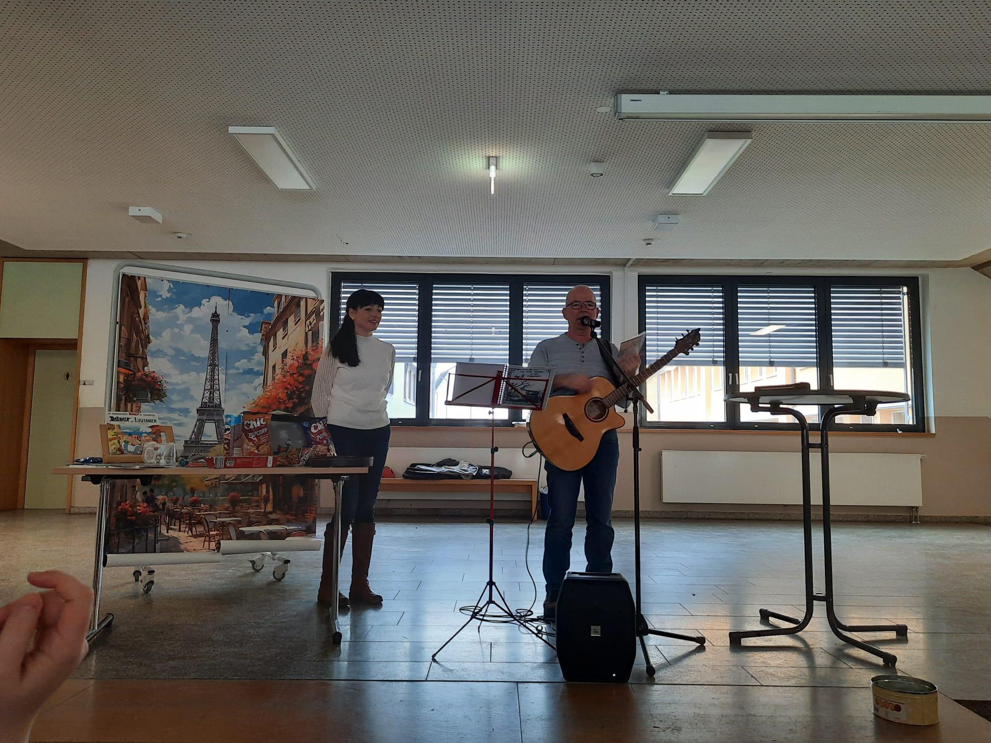 Dass dieser Tag ein besonderer war, fiel auch den anderen Schülern auf. Bereits am frühen Morgen fuhr ein nostalgischer und kreativ gestalteter Citroen 2CV im Pausenhof vor. Aus dem Fahrzeug stieg der Franzose Hervé Glatigny mit Gitarre und einen Koffer voller französischer Spiele. Einen Tag vorher besuchte er damit die Schüler der sechsten Klassen. Er erzählte Ihnen Geschichten auf Französisch, spielte französische Chansons vor und brachte ihnen auf spielerische Art die französische Sprache und Kultur näher.